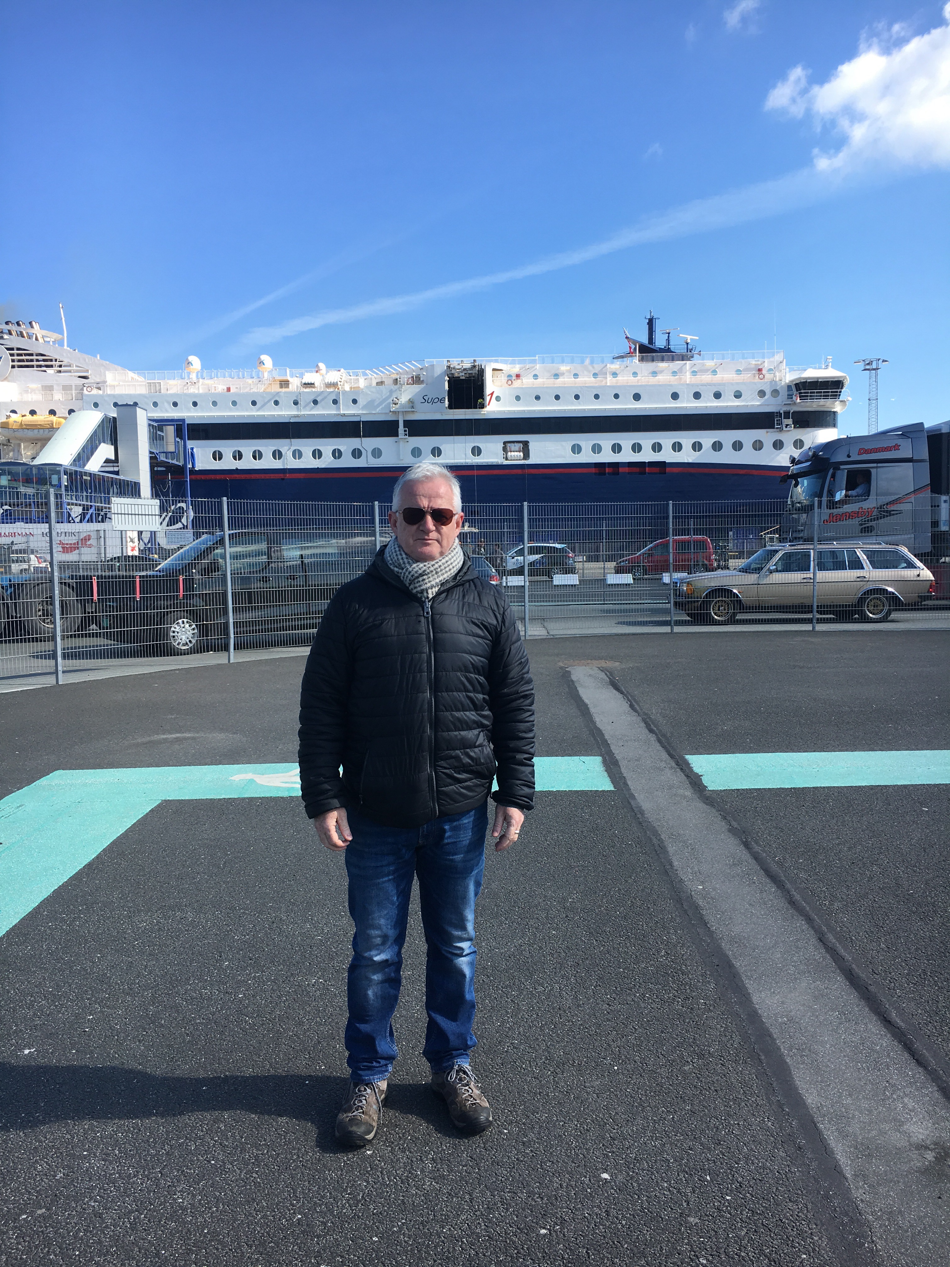 The romantic hut in the sanddunes was suddenly not so romantic in the middle of the night, when temperatures outside dropped into the minus. Even though I am a Scandinavian thoroughbred, even I have never quite understood the double-bed that is made up of two single beds, with two single duvets, which is neither romantic nor condusive for retaining heat. Mr. Jones complained at 7am that he was freezing and that he hadn’t slept for three hours. Here we go, I thought, as I listened to his chesty cough starting, not yet being able to work out if he was putting it on for sympathy (which never works with me anyway, so I don’t know why he does it?) or whether it in fact was for real? I was trying to remember what ‘cough medicine’ was in Danish! I got up and put the electric panel heater on (which Mr. Jones had insisted we should keep on all night, but I had refused, saying we’d wake up with dry throats and no voice). Yes, the heater under the window, under the flimsy curtains. I got Mr.Jones a pair of thick socks and a sweatshirt to put on top of his pyjamas, went back to bed, snuggled closer and put the two single duvets on top of each other. I gave up at 8am and got up. I felt remarkably awake, and alive on this cold Danish morning, so decided to take a walk on the beach, as a good start to the day. There is something about nordic air, it’s kind of sharp and thin, as if you could slice it with a knife. I found shards of ice on the puddles on the beach. I met Mr.Jones (remarkably showered and free of nasty chest cough?) back at the hotel for a hearty Danish breakfast at 9am. It consisted of the usual four to five different types of bread (no grey bread this time, see Day 2 of the blog), and about six to seven different cheeses, and a perfect boiled egg, where the yoke was still soft (not like in Germany, where the inside was almost green, sorry Germany, but a good boiled egg is one of life’s little pleasures). Now waiting for the Color Line boarding, I would say the day has greatly improved since 7am. The sun is shining from a clear blue sky and we are promised a good smooth sailing across the sea of Kattegat. I still have memories of rough crossings and seasickness from years ago.