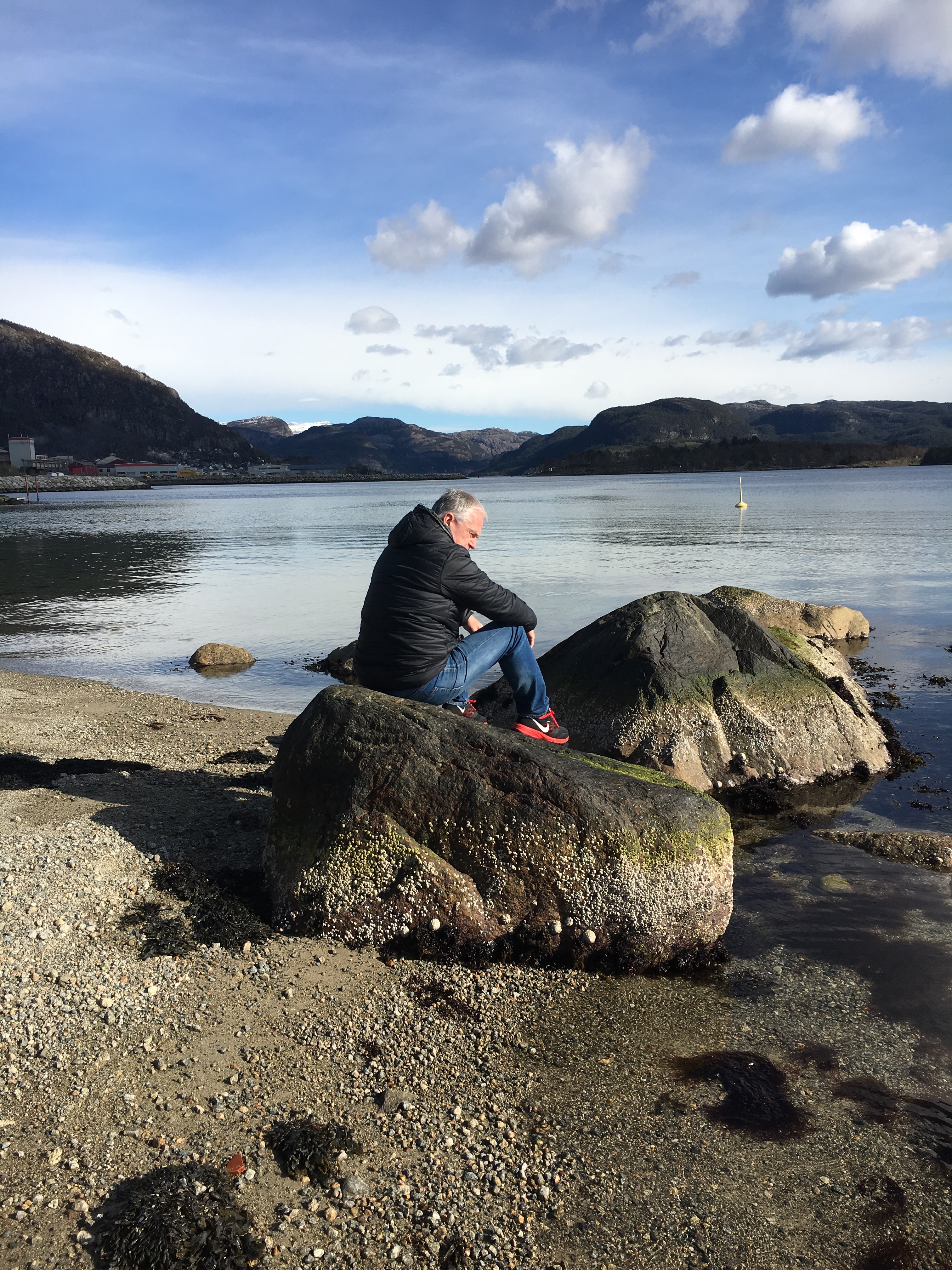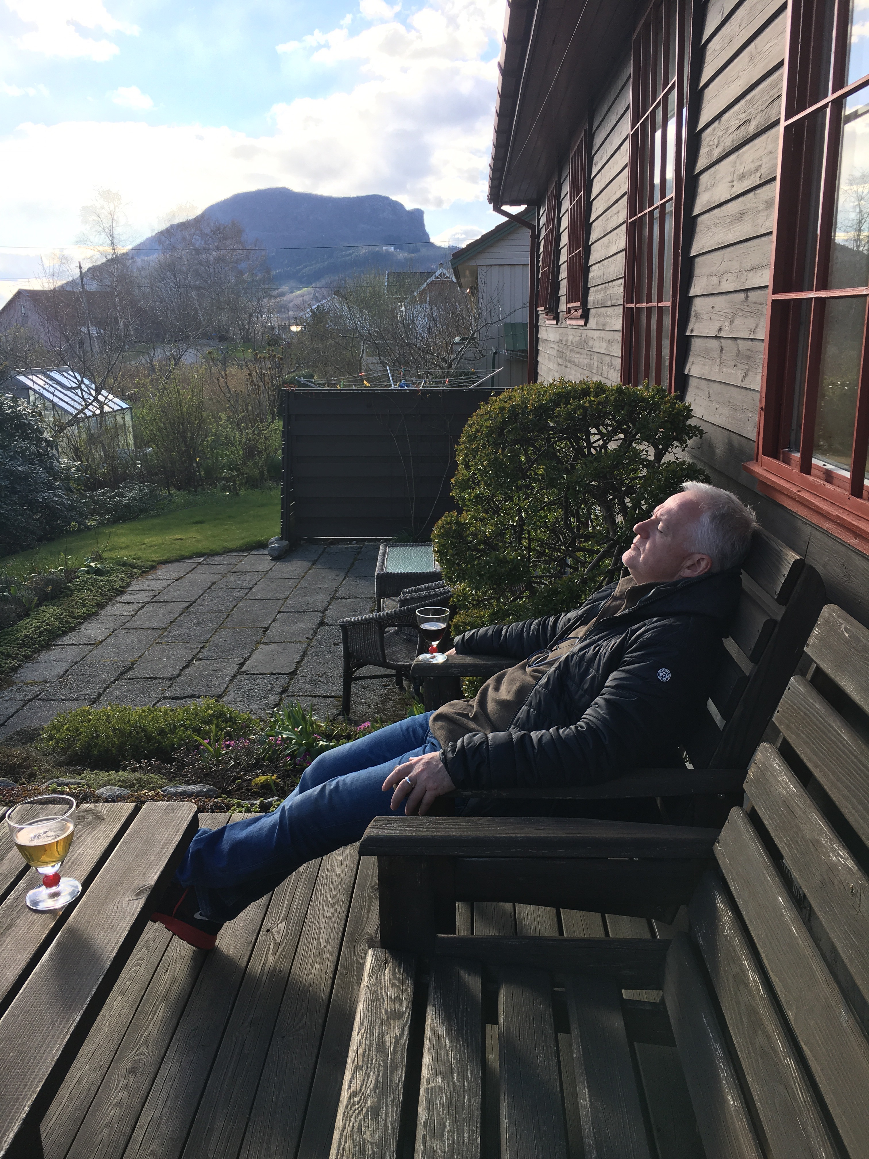 Norwegian life seems to be lived at a much slower pace in general, than what we are used to back home in Wales, but the last few days have been fast fast fast. Lots happening with mor’s house move. More packing and visits to our local Fretex shop, where Mr.Jones picked up another knitted cardigan, in exchange for mor’s plantpots (if you are after any nice outdoor or indoor plantpots, I suggest you pop down to Vågen soon, there may still be a few left). It was time for Ida (sister) and I to have our photo taken in front of our childhood home, as it may be the last time we are there together. Great for Ida (sister), Bjørn (brother) and I to have some time together, as this is rare. Dinner in brothers house, on the same day as Truls (clever nephew) had just passed his driving test and turned 18. Our book birthday gifts had gone down well. How apt to give a Norwegian 18 year old both ‘Of Mice and Men’ and 1984, by George Orwell. Did anyone else hear that this book was out of print, as sales had shot through the roof recently? Oh, and a welcome bit of sunshine on mor’s terrace for poor Mr.Jones who is still suffering with a nasty chest cough. I take back all the nasty comments about his health from previous posts, this cold is a serious one, it is not pretend, nor for sympathy. But I am still finding it difficult to get this stubborn Welsman to wear the right amount of clothing in this cold weather.