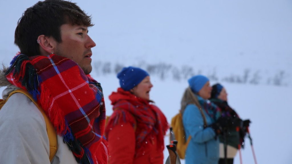 Close(d) Border Connection is a performance which takes the form of a joiking-walk in a landscape setting outdoors. The performers and the audience take a walk together, were they share time and space, as well as the joik [jåik]. This performance raises questions about the indigenous way of life (nomadic), borders and different ways of creative expression. At the same time, it also engages with the typical Norwegian tradition of walking in the outdoors [tu:r].